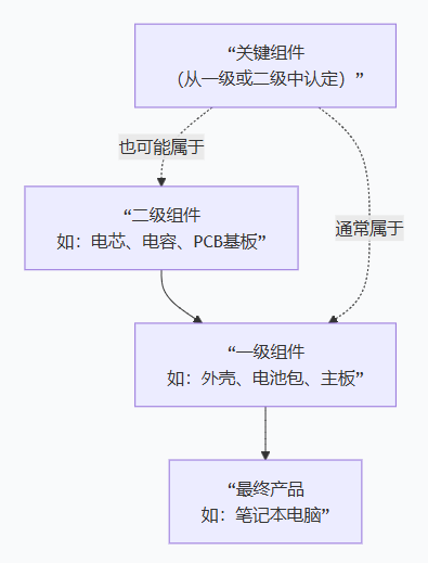 關(guān)鍵組件通常從一級或二級組件中認定。例如,筆記本電腦的主板(一級組件) 因其核心地位被認定為關(guān)鍵組件;而主板上的一顆中央處理器(CPU,可視為二級組件)更是關(guān)鍵中的關(guān)鍵。