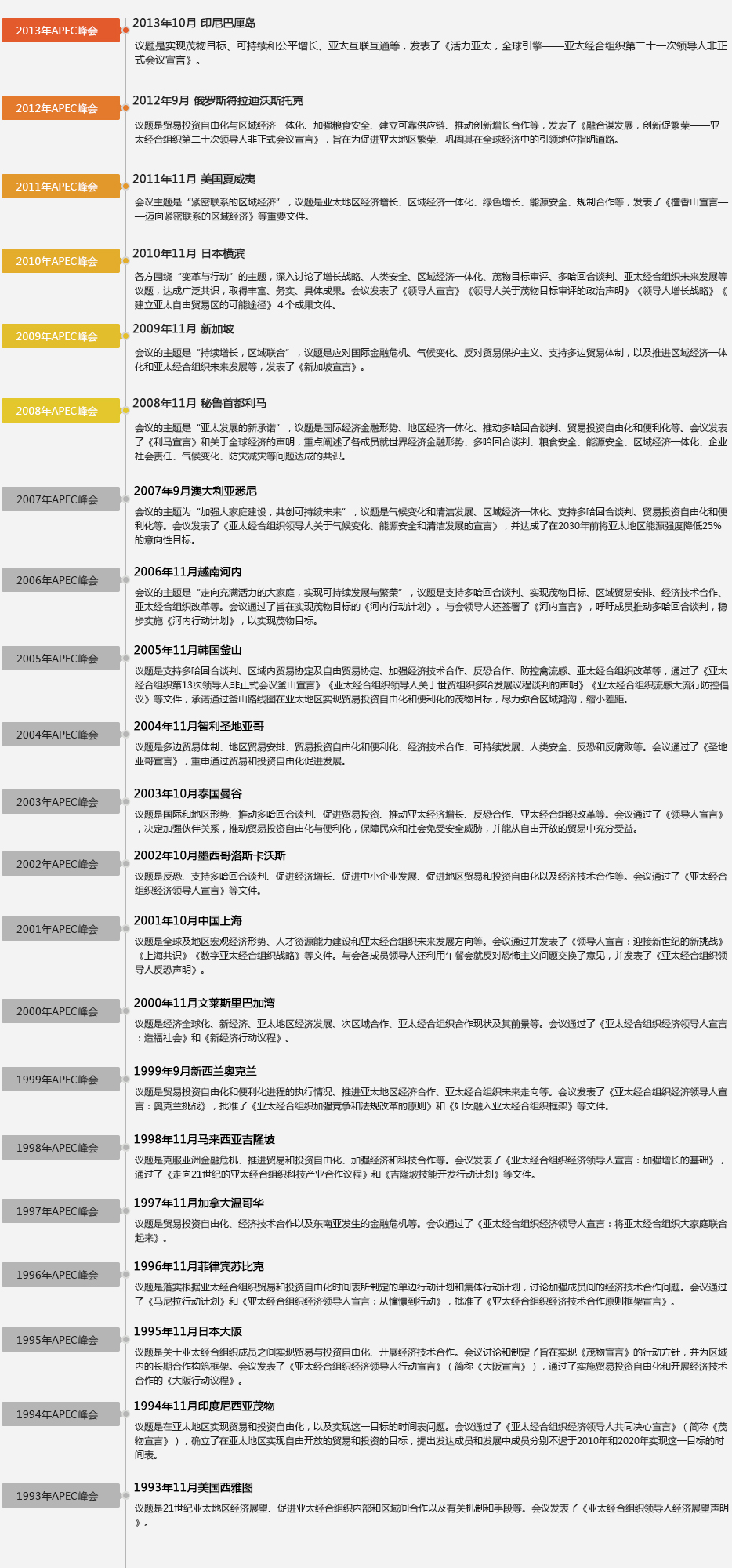 亞太經(jīng)合組織是亞太地區層級最高、領(lǐng)域最廣、最具影響力的經(jīng)濟合作機制。1989年11月5日-7日,澳大利亞、美國、日本、韓國、新西蘭、加拿大以及當時(shí)的東盟六國在澳大利亞首都堪培拉舉行APEC首屆部長(cháng)級會(huì )議,標志著(zhù)APEC正式成立。 APEC的宗旨是為本地區人民的共同生產(chǎn)單位保持經(jīng)濟增長(cháng)和發(fā)展;促進(jìn)成員間經(jīng)濟相互依存;加強開(kāi)放的多邊貿易體制;減少區域貿易和投資壁壘。【閱讀全文】
